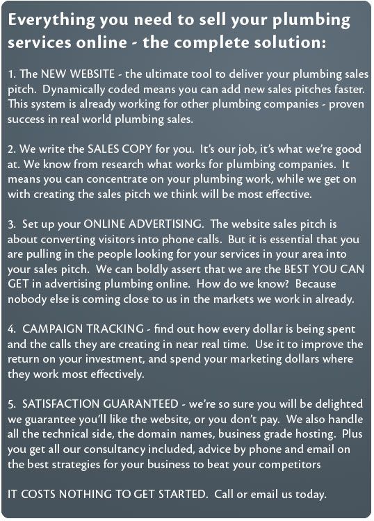 We have worked hard to create complete cost-effective solutions to promoting your plumbing business on the internet. As you will be aware, the internet has reached 'critical mass' in terms of availability - the chances are better than not that your next customer has an internet connection in their home. It's an essential part of marketing your plumbing business.
